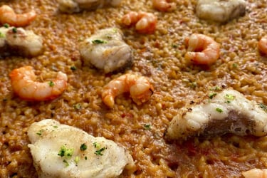 Arroz D.O. Albufera con nuestro fondo exclusivo de pescado y marisco. Todo ello con calamar, gamba y solomillo de pollo marinado. (Todo ya limpio, listo para disfrutar)