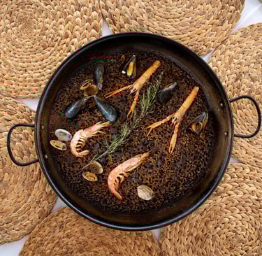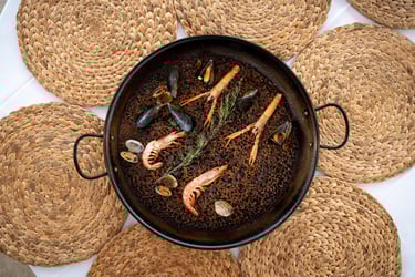 Arroz D.O. Albufera con nuestro fondo exclusivo de pescado y marisco. Todo ello con mejillones, calamar, almejas, cola de gambón y gamba. Por supuesto con la más exquisita tinta de sepia para darle su sabor característico