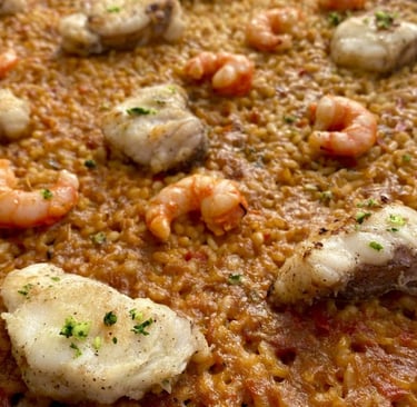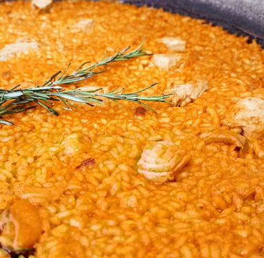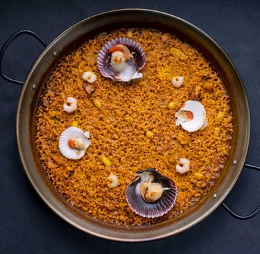 Arroz D.O. Albufera con nuestro fondo exclusivo de pescado y marisco. Todo ello con calamar, gamba, pulpo y zamburiñas, un sabor diferente y delicioso.